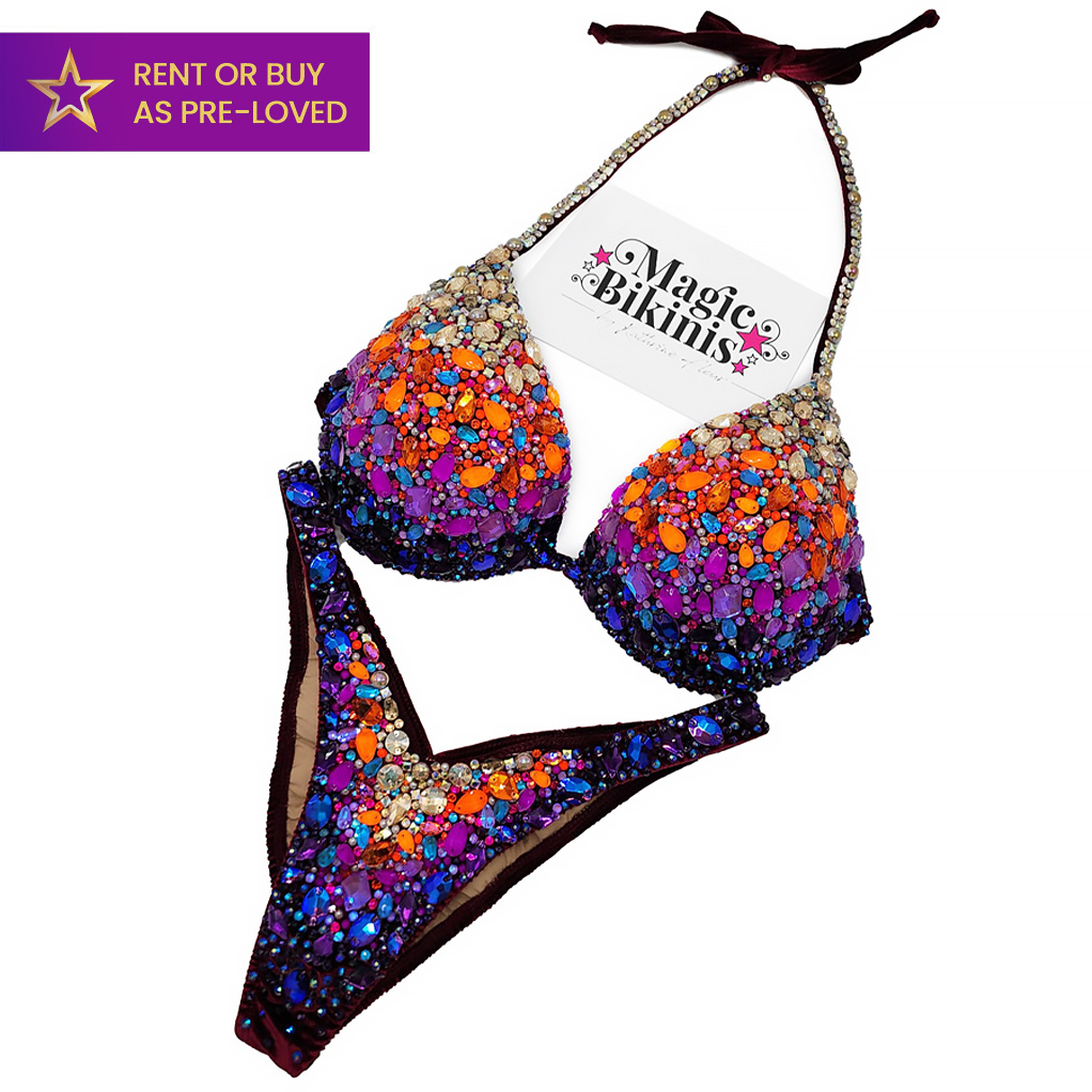 Sunset Deluxe IFBB Elite Pro Bikini Rental is a red velvet bikini rental from Magic Bikinis. The source copy positions it with IFBB Elite Pro styling cues.