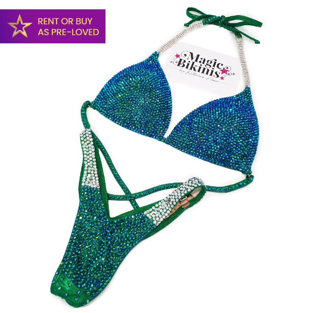 Glistening Sea NPC IFBB Pro League Figure Suit Rental is a green/silver lycra figure suit rental from Magic Bikinis. The source copy positions it with NPC & IFBB Pro League styling cues.